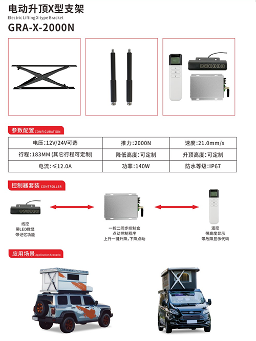 GRA-XS mainly used in the pick-up truck RV.The rated load of the whole support is 2000N The voltage l2V/24V for option. The minimum height of the support is 110mm, the maximum height after ascent is 910mm The whole set weighs 35kg